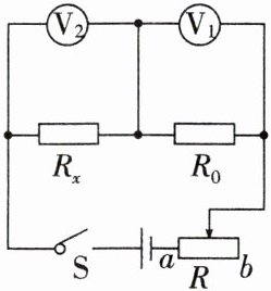 (2)由图可知,闭合开关S,$R_{x}$、$R_{0}$和滑动变阻器串联,电压表$ V_{1} $测$ R_{0} $两端的电压,示数为$ U_{1} $,电压表$ V_{2} $测$ R_{x} $两端的电压,其示数为$ U_{2} $,根据串联分压原理可得$\frac{U_{1}}{U_{2}}=\frac{R_{0}}{R_{x}}$,解得$ R_{x}=\frac{U_{2}}{U_{1}}R_{0} $.