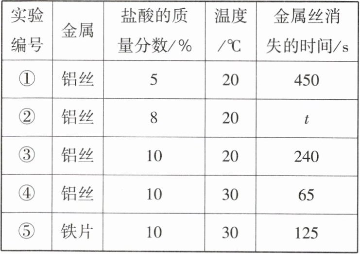 (5)实验②中盐酸的浓度比实验①中盐酸的浓度大,比实验③中盐酸的浓度小,所以在实验②中,铝丝消失的时间(用$t$表示)的取值范围是$240 < t < 450$。