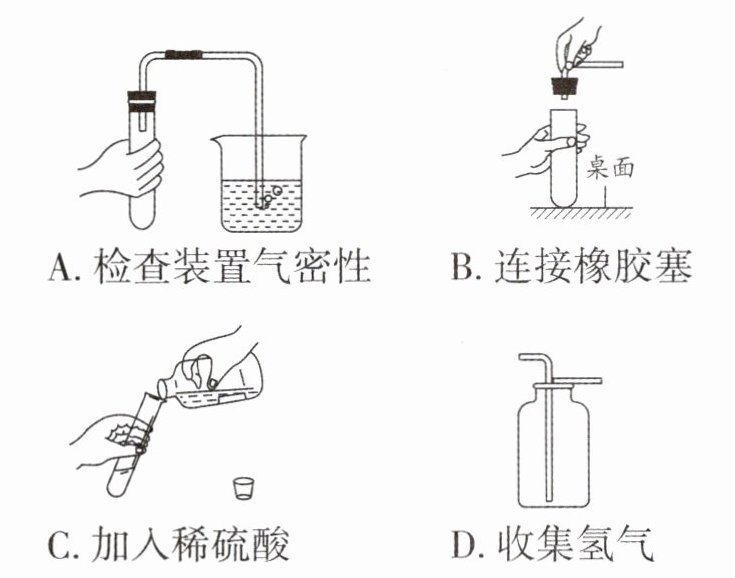 A 解析:检查装置气密性时,先将导管放入盛有水的烧杯中,然后用手握住试管,如果导管口有气泡冒出,则装置气密性良好,A正确;应把橡胶塞慢慢转动着塞进试管口,切不可把试管放在桌子上再使劲塞进塞子,以免压破容器,B错误;向试管中倒入液体,瓶塞倒放,标签朝向手心,瓶口紧挨试管口,试管中的液体量不能超过试管容积的$\frac {1}{3}$,C错误;氢气的密度比空气的密度小,应用向下排空气法收集氢气,D错误。
