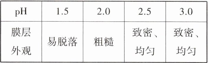 【实验3】已知pH≥3.5时,膜化剂不稳定。其他条件相同时,将薄钢片放入60℃、不同pH的膜化剂中浸泡20min,观察钢片表面形成的膜层外观。结果如表: