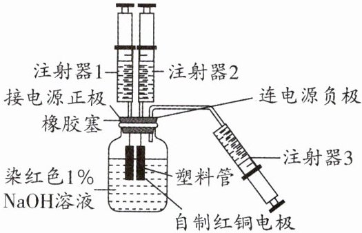 步骤1:检查装置气密性,用烧杯向广口瓶中加入500mL1%的氢氧化钠溶液,将导线穿过橡胶塞与自制红铜电极连接,将塑料管套在红铜电极上,上端插入橡胶塞上。塞紧胶塞,将橡胶管与50mL的注射器3连接好。