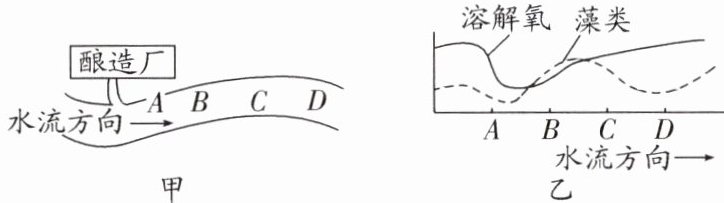 9.某校科技兴趣小组的同学在老师的指导下,对居民区附近的一条河(如图甲)进行溶解氧和藻类的测定,并根据所测结果绘成图乙,发现在AB段溶解氧和藻类大量减少。通过调查,了解到河流A上游附近有一个酿造厂将污水直接排入该河流。