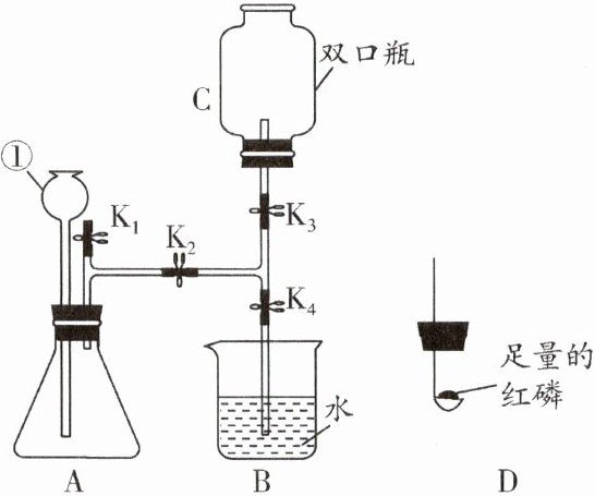 (5)关闭K₂后,装置A中的反应继续发生,生成更多的氧气,装置内的压强越来越大,甚至会将双孔橡胶塞弹出,打开K₁能排出A中继续产生的气体,防止瓶内压强过大;装置C中为氧气,红磷在氧气中燃烧的现象是剧烈燃烧,放出热量,产生大量白烟;红磷在氧气中燃烧后生成五氧化二磷粉末,双口瓶中的压强减小,且远小于瓶外的大气压,打开K₃后,大气压将烧杯中的水压入双口瓶中,观察到的现象是烧杯B中的水进入装置C。