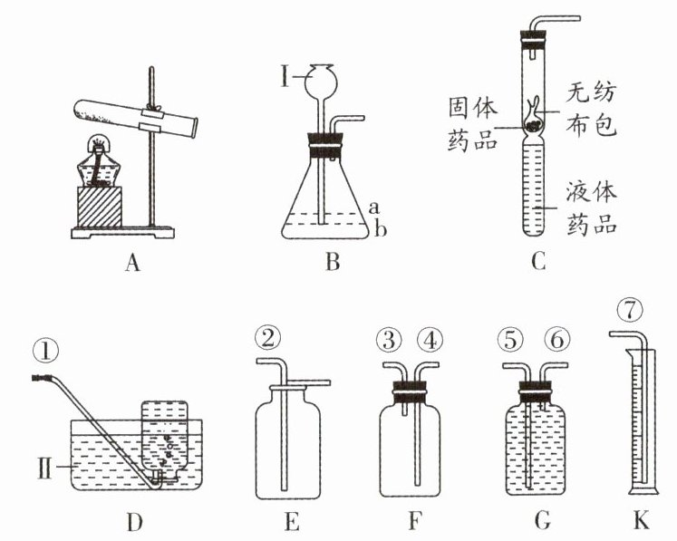 (3)若想要收集氧气并测量所得氧气体积,由于氧气不易溶于水,氧气的密度比水的密度小,可以选择集气瓶装满水,利用排水法(短管进、长管出)连接量筒收集氧气并测量所得氧气体积,选择G、K装置,故正确的连接顺序为发生装置导管→⑥→⑤→⑦。