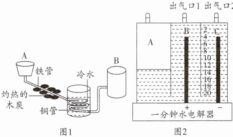 【经典回顾】(1)1783年,拉瓦锡利用如图1所示装置探究水的组成。往A杯中滴加少量的水,水通过灼热的铁管时发生汽化,水蒸气与灼热的铁反应,生成一种黑色固体四氧化三铁和“可燃空气”,将气体通过放在冷水中的铜管,在B装置中收集到纯净的“可燃空气”。最终拉瓦锡证明了水的组成。