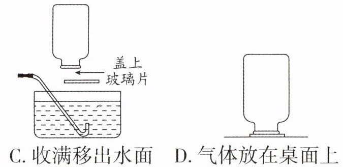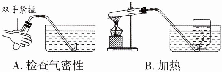 A 解析:检查装置气密性:组装好仪器,把导管的一端放入水中,用手紧握试管,水中的导管口有气泡冒出,证明装置的气密性良好,A正确;加热固体时,试管口应略向下倾斜,防止冷凝水倒流使试管炸裂,B错误;收集满氧气后要先用玻璃片把瓶口盖住,再拿出水面,C错误;氧气的密度比空气的密度大,收集后应正立放在桌面上,D错误。