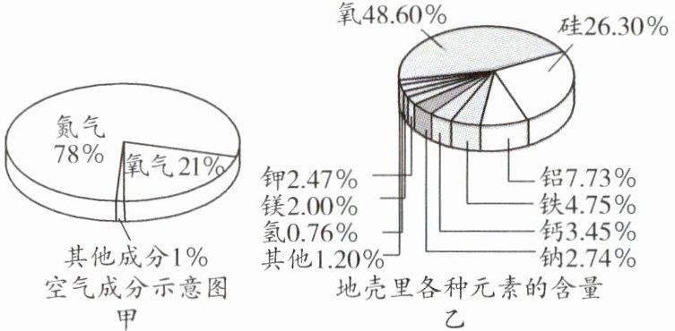 (1)图甲中表示的各气体的含量是指____(填“质量”或“体积”,下同)含量,图乙中表示各元素的含量是指____含量。