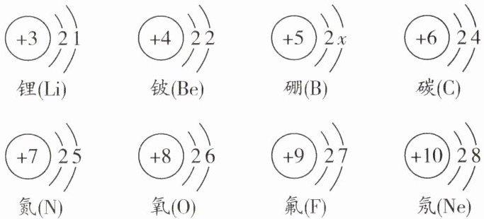 (2)在原子中,核电荷数=核外电子数,故硼原子结构示意图中的x = 5 - 2 = 3。