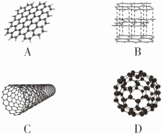 7. (2024·沧州期末)在发现$C_{60}$以前,人们一直认为碳元素只有金刚石和石墨两种单质。1985年英国科学家用大功率激光照射石墨等科技手段得到了$C_{60}$;1991年日本科学家发现了碳纳米管,它是碳原子以正六边形排列而成的管状结构,其可以提高金属的强度、硬度、磨损性能及热稳定性,可用于纳米机器人、计算机芯片等前沿领域;2004年英国科学家成功制得石墨烯,它是一种由碳原子构成的单层呈蜂巢晶格的二维碳纳米材料,在很多领域都得到广泛的应用,例如:2022年北京冬奥会工作人员的防寒服用石墨烯发热材料制作,通过供电能迅速产生热量。