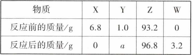 D 解析:一定条件下,X、Y、Z、W四种物质在密闭容器中充分反应,根据质量守恒定律,则有6.8g + 1.0g + 93.2g + 0g = 0g + a g + 96.8g + 3.2g,a = 1.0;反应后X的质量减少了6.8g - 0g = 6.8g,则X为反应物;反应后Z的质量增加了96.8g - 93.2g = 3.6g,则Z为生成物;反应后W的质量增加了3.2g - 0g = 3.2g,则W为生成物;反应前后Y的质量不变,则Y可能是该反应的催化剂,也可能是没有参与反应的杂质;故该反应为X在一定条件下生成Z和W,属于分解反应。由分析可知,A、B错误;由分析可知,X与W的质量变化量之比为(6.8g - 0g):(3.2g - 0g) = 6.8g:3.2g = 17:8,但因为反应式中X与W的化学计量数之比未知,故无法判断其相对分子质量之比,C错误;由分析可知,Z与W质量变化量之比一定为(96.8g - 93.2g):(3.2g - 0g) = 3.6g:3.2g = 9:8,D正确。