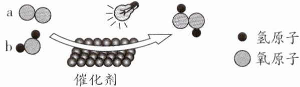 C 解析:根据质量守恒定律,反应前后原子种类和数目不变,A错误;反应后催化剂的质量不变,B错误;由题图可知,一个b分子是由1个氧原子和2个氢原子构成的,则b的化学式为H₂O,C正确;由题图可知,氧气和水在催化剂的作用下反应生成过氧化氢,化学方程式为$O₂ + 2H₂O\xlongequal{催化剂}2H₂O₂,$则参加反应的a、b分子个数比为1:2,D错误。