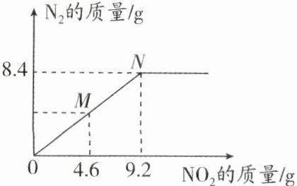 代入,则x:y = (2c - b):2d = 2b:2d,已知2b = d,则x:y = 2b:2d = d:2d = 1:2,B正确;N点时消耗二氧化氮的质量为9.2g,则生成水的质量 = 9.2g×$\frac{32}{46}$÷$\frac{16}{18}$ = 7.2g,C错误;反应的二氧化氮和生成水的质量比 = 46b:18d = 23:18;反应的二氧化氮和生成氮气的质量比为9.2g:8.4g = 23:21,所以当消耗4.6g二氧化氮时,生成水的质量 = 4.6g×$\frac{18}{23}$ = 3.6g,生成氮气的质量 = 4.6g×$\frac{21}{23}$ = 4.2g,则M点时消耗肼的质量 = 3.6g + 4.2g - 4.6g = 3.2g,D正确。