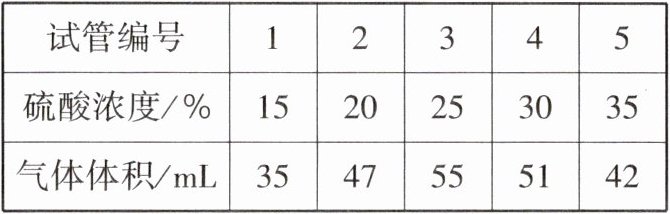 (1)观察实验一图表,3号试管收集的气体最多,此试管中硫酸浓度是25%;浓度大于或小于此浓度值生成的气体体积都较少。