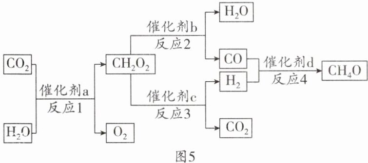 (6)①反应1为二氧化碳和水在催化剂a的催化作用下生成CH₂O₂和O₂;②甲酸在催化剂b、c的作用下生成的物质不同,则对催化剂新的认识是反应物相同,催化剂的种类不同,生成物有可能不同;③由图5可知,水和二氧化碳既是反应物又是生成物,则可循环利用的物质是水和二氧化碳。