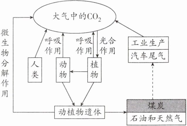 D 解析:植物光合作用利用二氧化碳和水生成有机物和氧气,则植树造林有利于吸收大气中的二氧化碳,A正确;二氧化碳是光合作用的原料,可促进植物的光合作用,利于植物生长,是最好的气体肥料,B正确;二氧化碳和水反应生成碳酸,显酸性,大气中二氧化碳含量持续偏高,会导致海洋酸化,C正确;冬季绿色植物的光合作用减弱,还需要燃烧大量的化石燃料取暖,则同一年度中,二氧化碳的含量冬季会明显高于夏季,D错误。