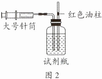 (4)探究溶解能力:如图2,用大号针筒抽取200mL二氧化碳气体,试剂瓶中加入200mL水(恰好加满),塞紧双孔橡皮塞,连接大号针筒和试剂瓶,缓慢推动活塞,将二氧化碳注入水中。当向水中注入$CO_2$气体体积达到120mL时,红色油柱开始向上移动,实验表明在该条件下,1体积水中能溶解____体积二氧化碳。