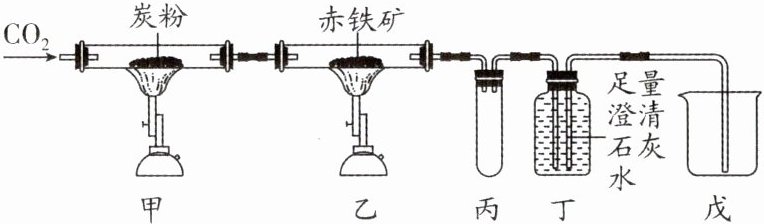 A. 一段时间后,甲装置中黑色炭粉减少,丁中澄清石灰水变浑浊