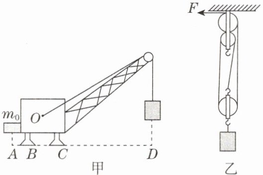 8.教材素材题 如图甲,为了保证起重机在吊起货物时不会翻倒,在起重机左边配有一个重物$m_{0}= 3×10^{3}kg$,已知$AB= 1m$,$BC= 2m$,$CD= 9m$。现用起重机把货物匀速提起,不计绳重、摩擦和起重机本身重力,g取10N/kg。