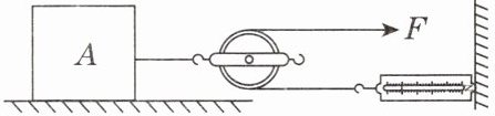 10. 如图所示,在水平拉力 $ F $ 的作用下,物体 $ A $ 沿水平面以 $ 0.2 \mathrm { m / s } $ 的速度匀速运动了 $ 5 \mathrm { s } $,弹簧测力计的示数为 $ 8 \mathrm { N } $(不计滑轮处的摩擦,滑轮和绳重),拉力 $ F $ 做功的功率为 (