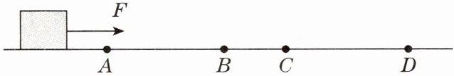 7. 如图所示,物块在水平拉力F(大小未知)的作用下,在水平直线轨道上运动,其中AB= CD= 10m。已知物块在AB段和CD段分别以2m/s和4m/s的速度匀速运动,且在AB段、CD段所受摩擦力分别为1N和2N,则该物块通过AB段和CD段所用的时间之比为