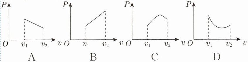 11. (图像分析)[2025·苏州工业园区期中]为了保证消费者权益,国家会对销售车辆进行全面的检测。动力检测时,汽车在专用的测量装置上全力加速,仪器记录车轮转速v与车轮驱动力F大小,再通过计算得出车辆在不同车速下的输出功率,某汽车在速度$v_1~v_2$区间内车轮驱动力F与车速v的关系如图所示。则该速度区间内,车辆功率P与车速v关系的图像可能是 (