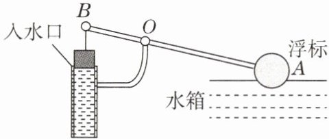 15. 如图所示是一种抽水马桶水箱自动上水装置的示意图。当水箱内的水达到一定高度时,浮标带动杠杆AOB压住入水口,停止上水。请在图中画出动力$F_1($水箱里的水给杠杆AOB的力)和B处阻力臂$l_2。$