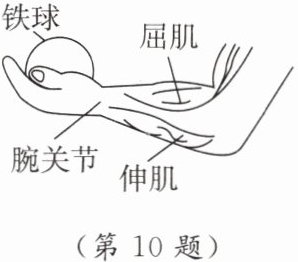 10. [2025·泰州期中]如图所示,当手托住铁球并绕腕关节向上转动时,手就类似一个杠杆。铁球对掌心的压力是