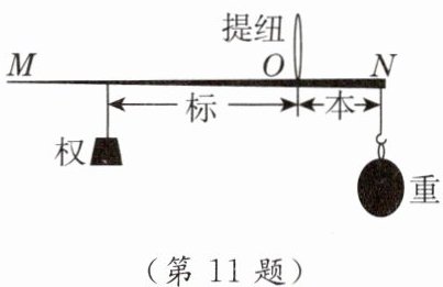 11. (教材素材题)《墨经》最早记述了杠杆原理。如图所示,杠杆MON可以绕提纽O转动。当MON将要顺时针转动时,“重”表示