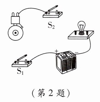 2. 如图所示,请用笔画线代替导线将电路连接完整,要求:电铃与灯泡并联,开关$S_{1}$控制整个电路,开关$S_{2}$只控制电铃。
