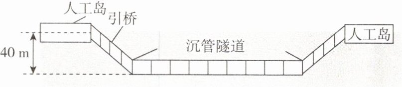 5. 港珠澳大桥是中国第一条集桥、双人工岛、隧道为一体的跨海通道,其中长约5600m的沉管隧道通过引桥与人工岛路面相连,引桥长约1000m,竖直高度为40m,其简化图如图所示。重$5×10^4N$的汽车(大小不计)在沉管隧道中以90km/h的速度匀速行驶,所受阻力为其重力的1/20,行驶到引桥底端后开始匀速爬升,其功率增大到90kW,耗时45s到达人工岛路面,求: