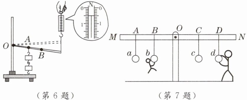 7. (跨学科实践)如图所示,杠杆MON可绕O点转动,a、b、c、d是四个供人娱乐的吊环,2OB= OD,父子俩在吊环上做游戏,质量为40kg的儿子吊在b环上,父亲站在地面上竖直向下拉着d环。(g取10N/kg)