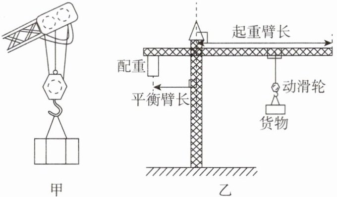 (3)图乙中悬吊货物所用动滑轮与图甲中相同,若配重质量M= 3t,平衡臂长$l_1= 5m,$起重臂长$l_2= 15m,$当把货物送至最右端且塔臂在水平位置平衡时,求此时货物的质量$m_2$。