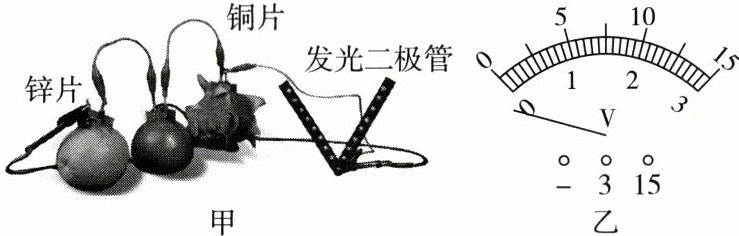 13. (教材素材题)[2025·连云港期中改编]如图甲所示,小明用酸甜多汁的水果提供的电能点亮了发光二极管,其中水果能给电路提供