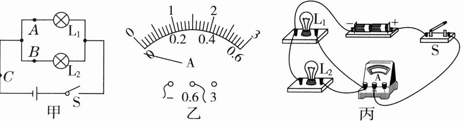 (3)小明连接了如图丙的实物图,电流表测的是图甲中______(填字母)处的电流。若要测通过$L_{1}$的电流,请在需要改接的那一根导线上打“×”,用笔画线代替导线画出正确的连接。