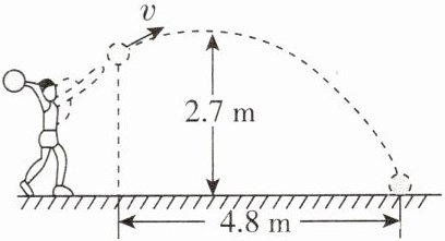5. [2025·苏州期中改编]在体育考试中,小明投出的实心球在空中的运动轨迹如图所示。若实心球质量是$2kg$,从最高点到落地点的过程中,球下降的高度为$2.7m$,用时为$0.75s$,球从离开手到落地过程中水平飞行距离为$4.8m$,则球下降过程中重力做功为