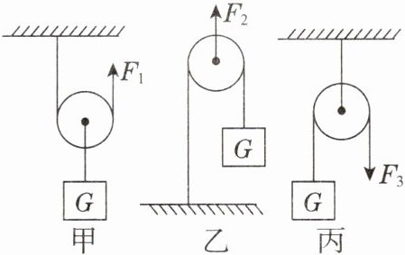 3. 如图所示,利用三个质量相同的滑轮提起相同质量的重物$G$时,所需拉力分别为$F_{1}$、$F_{2}和F_{3}$,不计绳重和摩擦,若滑轮和物重分别为$2N和10N$,匀速提升重物$G$时,拉力最大的是