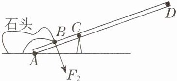 1. 如图所示,$AB = BC = \frac{1}{4}CD$,石头对杠杆的阻力$F_{2} = 60N$,且方向垂直于杠杆。请分析,撬动石头时,以