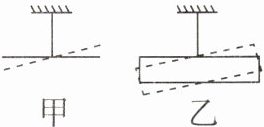 2. [2024·上海宝山区改编]图中甲为一质量均匀的杠杆,忽略其厚度和宽度,乙为一质量均匀的长方形薄木板,忽略其厚度。分别用细线将它们悬起,悬点分别为甲的中点和乙的上边缘中点,它们都能在水平位置保持平衡。若将它们都沿悬点缓慢转过一个小角度到虚线所示的位置,释放后,在该位置(