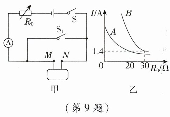 9. [2024·泰州]电子技师社团活动中小明对一个暗箱进行研究。暗箱表面有两个接线柱M、N,内部只接有$R_{1}$和$R_{2}$两个定值电阻,$R_{1}$阻值为6Ω,$R_{2}$阻值未知。小明用图甲所示的电路(电源电压不变)进行实验,在S、$S_{1}$都闭合和S闭合、$S_{1}$断开的两种情况下,改变电阻箱$R_{0}$的阻值,读取电流表示数I,绘制了如图乙所示的I随$R_{0}$阻值变化的图像。下列判断中正确的是 (