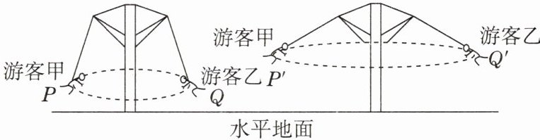 9. 如图所示为游乐场中旋转飞椅的示意图。飞椅和游客的运动速度越大,他们会被“甩”得越高。游客乙从图中的位置Q变化到位置Q'的过程中,他的动能