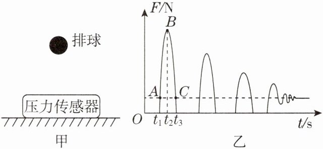 8. 如图甲所示,压力传感器能够测量出其表面受到的压力大小,与电脑连接后,放置在水平地面上,将一排球从正上方某一高度处由静止释放,排球落到传感器上后再竖直弹起上升,反复多次后静止在传感器上。传感器测得的弹力F的大小随时间t变化情况如图乙所示,A、B、C三点对应的时刻是$t_1、$$t_2、$$t_3,$下列说法中正确的是(