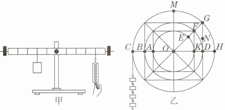 (3)小宁又制作了一个密度均匀的圆盘(相当于杠杆),圆盘可以绕着圆心O转动(转轴阻力忽略不计),他先在圆盘的C点挂上4个钩码(如图乙),再用一个量程合适的弹簧测力计在M点施加竖直向上的拉力后,圆盘