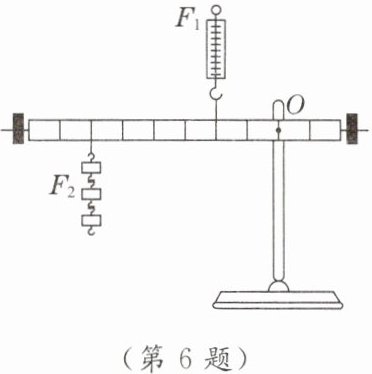6.小明在探究杠杆的平衡条件的实验中,如图所示,将杠杆提升至水平位置静止,此时测力计竖直向上的拉力$F_{1}$为6N,每个钩码的重力均为0.5N,经计算发现,$F_{1}$与其力臂的乘积
