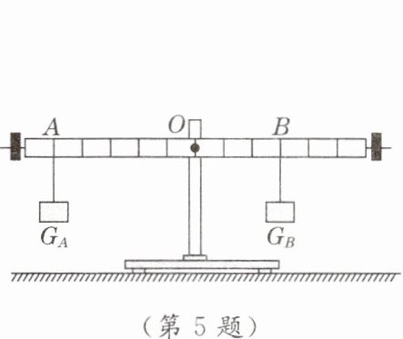 5.[2024·镇江期中]如图所示,杠杆调至水平平衡以后,将两个重物分别挂在杠杆两侧的A、B处,杠杆仍然平衡,则两重物重力大小之比$G_{A}:G_{B}=$