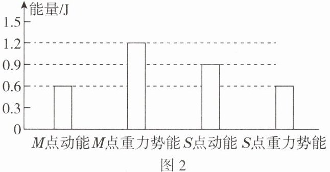 甲、乙;1.5~1.8 点拨:由图 2 可知,小球在 M 点的动能为 0.6 J,重力势能为 1.2 J,则小球在 M 点的机械能$E_{M}=0.6J+1.2J=1.8J$;小球在 S 点的动能为 0.9 J,重力势能为 0.6 J,则小球在 S 点的机械能$E_{S}=0.9J+0.6J=1.5J$。因为小球在 M 点的重力势能大于在 S 点的重力势能,所以小球在 M 点的高度大于在 S 点的高度,即 M 在上、S 在下,又因为$E_{M}>E_{S}$,小球在运动过程中受到空气阻力作用,机械能越来越小,所以小球先经过 M 点再经过 S 点,故 M、S 两点位置关系可能是图 1 中的甲、乙;因为 N 点在 M 点和 S 点之间,所以 N 点的机械能可能在 1.5~1.8 J 之间。