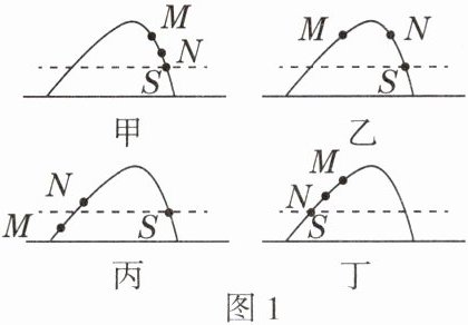 4. (科学推理)小明用力向右上方抛出一个小球,小球的运动轨迹如图1所示,在它运动过程中,先后经过M、N和S三点,其中M、S两点某时刻的能量如图2所示。则图1中的______图可能与图2存在对应关系,N点机械能大小范围可能在______J之间。