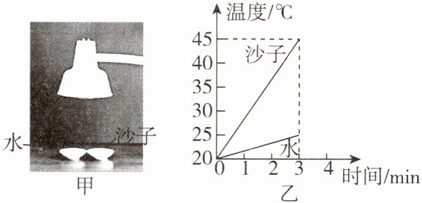 3. (教材素材题)将水和沙子分别放在两个瓷盘中,用温度计测出室温即为此时沙子和水的温度。如图甲所示,用红外灯均匀照射两个瓷盘3min,小明每隔1min使用红外相机拍摄红外照片,根据读出的温度数据绘制了温度-时间图像,如图乙所示。