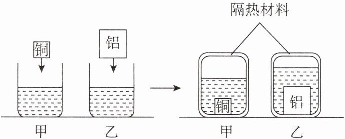 9. [2025·广大附中月考]将质量相等的铜块和铝块放入冰箱,使它们的温度降低到0℃,取出后,将铜块、铝块分别放入盛有质量相等、温度都是23℃的水的容器中,如图所示,将容器用隔热材料密封,一段时间后温度稳定,同时测量甲、乙两容器中水的温度,分别是20℃和17℃,忽略热量损失,则下列正确的是 (