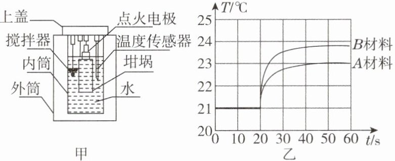 10. (科学推理)[2024·无锡期中]热值是表征建筑材料潜在火灾危险性的重要参数。如图甲所示的“量热仪”(简化原理图)可以测定建筑材料的热值,取2g碾碎的材料样品放入坩埚中,点火电极点燃后,样品在助燃剂的作用下燃烧,使内筒里1kg的水升温,温度传感器获取的水温随时间的变化情况如图乙所示。实验中,取碾碎的材料样品并加入助燃剂的目的是