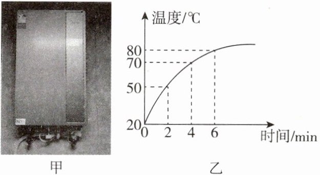 6. 某同学对小明家新装燃气热水器(如图甲)耗能进行测试,按表中热水器铭牌事先在热水器水箱中注满水,将与计算机相连的红外线热传感器接入热水器水箱后,开始加热。计算机显示出热水器中水的温度随时间变化的图像如图乙。天然气的热值为$4×10^{7}J/m^{3}$,水的密度为$1.0×10^{3}kg/m^{3}$,水的比热容为$4.2×10^{3}J/(kg\cdot ^{\circ }C)$。